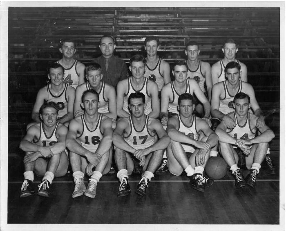 A black and white photo of a mens basketball team. The men are all wearing dark colored shoes except the man in the second man on the left in the front row. They are all wearing showrs and tank tops. In the back row the second man on the left is in a military uniform and tie. They are sitting on the floor and bleachers in a gym. On the back it says the names and hometowns of the guys in the picture. Some of the names are Jim Boud, Jack Cheek, Glen, Gene Hiatt, Cliff Young, Billy, Don, Everett L. Thompson, Finley, and there are more but the writing is difficult to read.