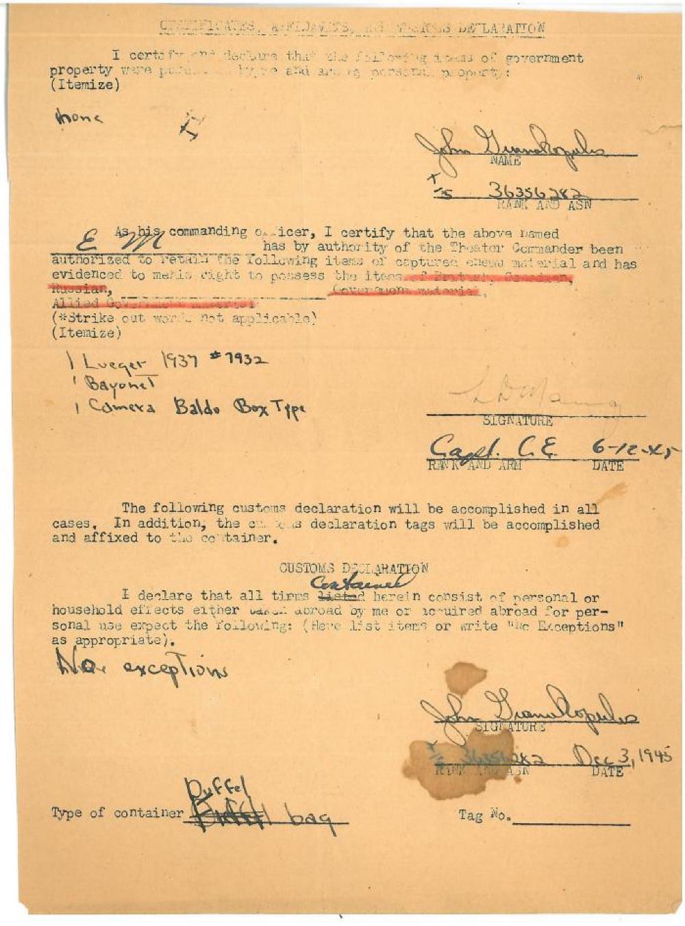 The top of the document is faded and difficult to read but it says that the following items of government property was purchased and now owned by John Gianakopulos. The items listed were one Lueget 1937 #7932, one bayonet, one camera Baldo botx type. There are some stains on the document and the type of container he is using is a duffel bag. It was signed in December 3, 1945.