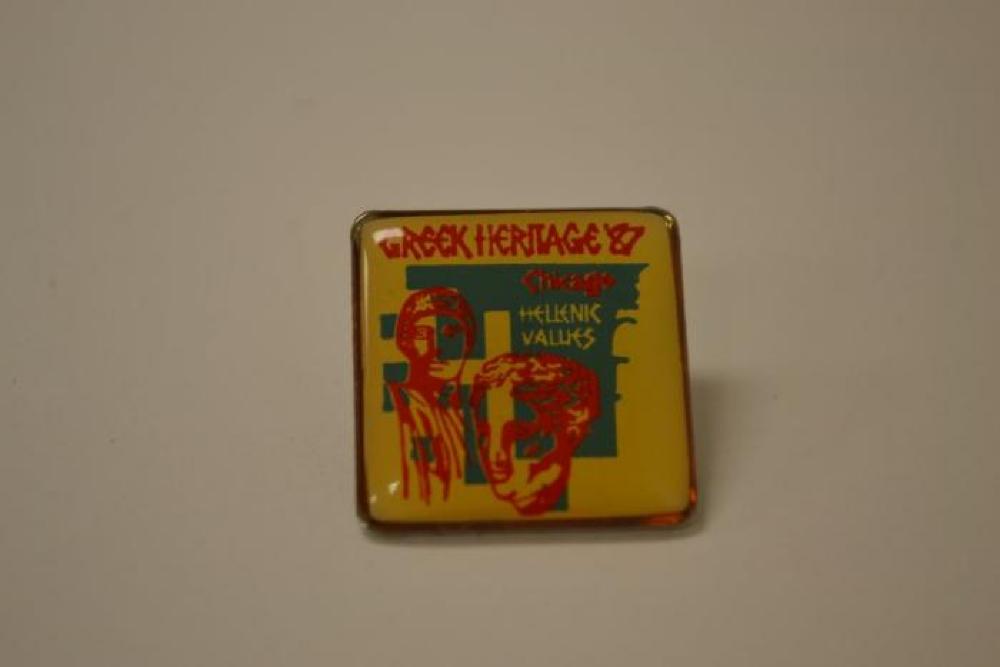 Square enamel pin: face background is yellow set on a silver back. Pin depicts abstract green motiff (right side corinthian column capital; left side cross). Layered over motiff are red sketch-outlines of two busts(left a toga wearing male; right a woman's head). Red text on top of pin reads "Greek Heritage '87." Lower text reads "Chicago Hellenic Values. Over the pin face is a glossy laquer