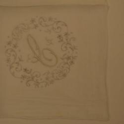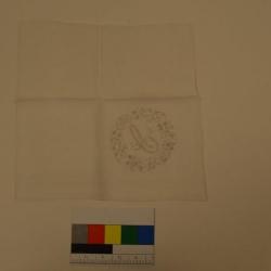 Square white, embroidered, handkerchief. The fabric is machine made, with hand made embroidery. The edges are outlined by 18 small lines. In the corner there is a circle made up of flowers. In the center of the circle there is the initial e.