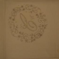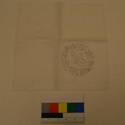 Square white, embroidered, handkerchief. The fabric is machine made, with hand made embroidery. The edges are outlined by 18 small lines. In the corner there is a circle made up of flowers. In the center of the circle there is the initial e.