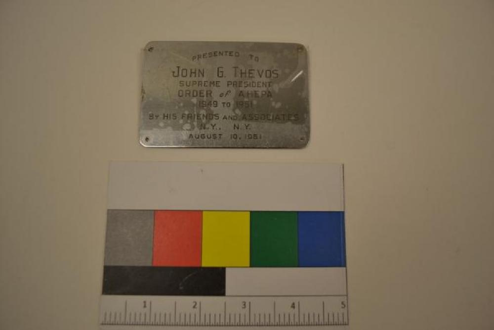 Donated by Aphrodite Tsairis Thevos. An AHEPA plague given to John G. Thevos for being the supreme president of AHEPA from 1949-1951. The plaque was awarded August 10, 1951.