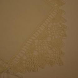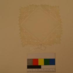 White, square, hand made, doily. The center of the square is a diamond shaped piece of factory made fabric. Surrounding the fabric is croachet making the square. The edges are wavy.