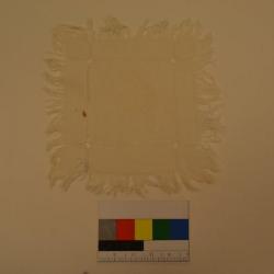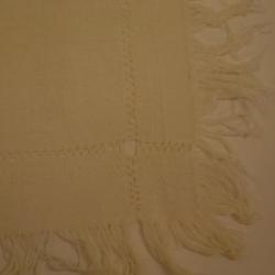 square, cream, hand embroidered, doily. The piece of fabric is factory made. cream tassels are embroidered onto all of the edges. There is a boarder with in the fabric that is a criss cross pattern.