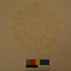 White, circular, hand embroidered, doily. The center of the doily is a circle with 3 rings. Branching out from the cirlce are 15 diamond shaped lines that connect to 15 circular flowers.