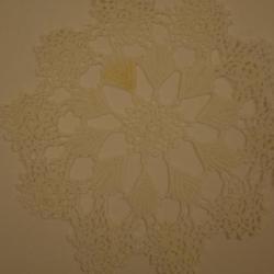 Donated on behalf of Cleo and Barootes Guigulis by Celia Kachmarski. The hand embroidered doily was made by the donors mother Anastasia Barootes, circa 1930-1960.