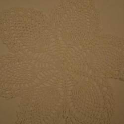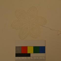 Small, white, flower shaped, hand embroidered, doily. The center of the doily is a small circle with webbing around it, that changes into 6 leaves.