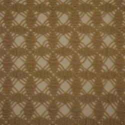 Tan, square, hand embroidered doily. The whold doily is made up of small four point crosses, with circles going around each. The edges have small have half circles with a tab on the top of each one