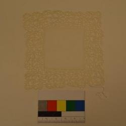 White, square, hand embroidered, doily. The center of the square is a square piece of machine made fabric. Surround the fabric is hand embroidery. The boarder is a cross with a circle around it. There are 12 crossing making up the edges of the square.