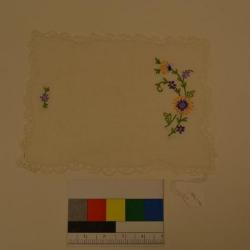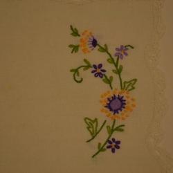 White, rectangle, floral, hand embroidered, doily. The center of the doily is a rectangle piece of machine made fabric. On one end of the fabric there is 5 flowers and vines. On the other end there is one small flower and steam. The flowers are purple and yellow, with the vines being green. The boarders of the doily are embroidered half circles.