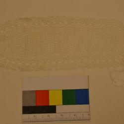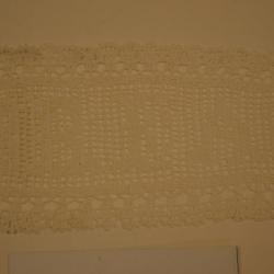 White, oval, hand embroidered, doily. In the center of the doily the world "bread" is embroidered. Around the word it is tightly woven embroidery. With the edge being small half circles.