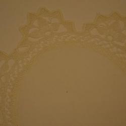 Cream, circle, hand embroidered, doily. The center of the doily is a circular piece of machine made fabric. Surround the fabric is hand embroidery. The boarder is a half circle sun shape with 6 points. Inside each half circle is a 3 point plant design.