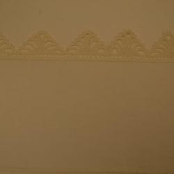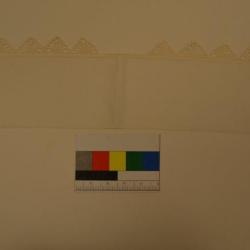 White, rectangle, doily. The rectangle is a piece of machine made fabric. The top of the piece of fabric is hand embroidered triangles. There are 5 with a space in the middle and then 5 more triangles.