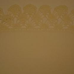 Cream, oval, hand embroidered, doily. The center of the oval has an oval shaped piece of machine made fabric. Around the fabric there are small embroidered triangles that lead into a fan design.