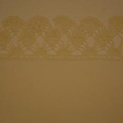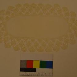 Cream, oval, hand embroidered, doily. The center of the oval has an oval shaped piece of machine made fabric. Around the fabric there are small embroidered triangles that lead into a fan design.