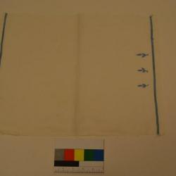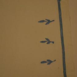 Cream, rectangle, hand embroidered towel. At both ends of the towel there is a line of light blue embroidery. On one end along with the line there are 3 embroidered plants in baby blue.