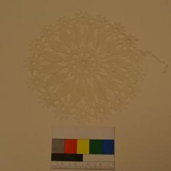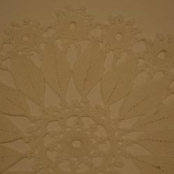 White, circle, hand made doily. The center of the circle is a flower with 10 waves to it. Surround the center circle are 17 leaves. The outter edge of the circle are small flowers with 10 points connected to each other making the boarder.