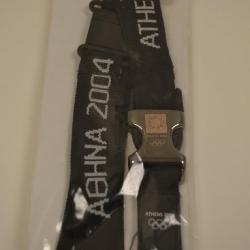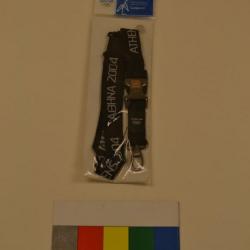 A black lanyard with "ATHENS 2004" written in Greek repeatedly around the outside. On the clasp there is a small picture of a laurel and "ATHENS 2004" printed above the Olympic rings. The lanyard has a silver clip at the bottom.