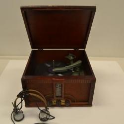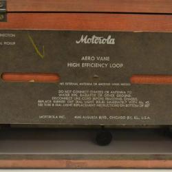 Motorola, Inc. walnut wood phonograph. Its a Motorola Aero Vane High Efficiency Loop phonograph with headphones. This model is 67F12 with the serial number 3350, both are located on the bottom of the phonograph. On the back there is a wood plaque from Motorola with their address and there is instructions for antenna use as well as how to change the dial bulbs. This phonograph was sold and used as an consumer electronic device in 1948.