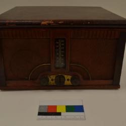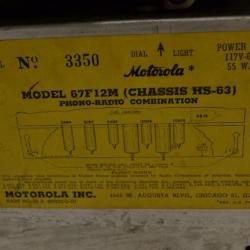Donated by Dr. Constatine Godellas. The phonograph was made in Chicago in 1948, the sticker on the bottom says Jan 14,1948. The serial number is 3350 and the model is 67F12. Motorol started off as a private company but in 1943 the company sold stock to the public. Motorola also spread its reach over seas during WWII.