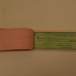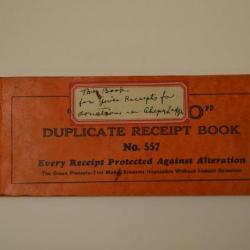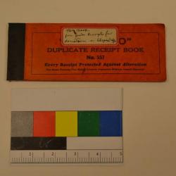 This booklet is of receipts. The cover is orange with balck printing in English. The front and back covers are made from a cardboard. The inside pages are pink carbon copies of receipts with a few non-carbon white paper receipts.