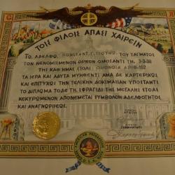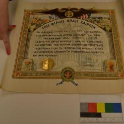 This is a certificate is off-white (due to age). There are several many picures on here: at the top are two birds near the American and Greek flags, On the sides are colums, and at the bottom left a tripod at bottom right a stack of grains. At the bottom center there is the symbol of GAPA. A Greek meander pattern is teh border. All the pictures are in color. At each corner of this award are the letters G-A-P-and A in red. There is also a gold seal on the front. Everything is written in Greek.