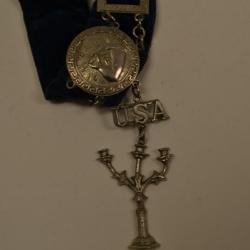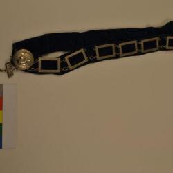 This belt is made of blue velvet. It has 14 metal rectangles attached to it. These squares have the Greek meander pattern around them. There are also two circle metals. Around them are the Greek meander pattern. In the center is a symbol of GAPA. Dangling off the bottom of this belt are two metals: one is of the letters "USA" and underneath that is figure of a candel-holder. sewn onto the blue velvet is a piece of material on which says "Rose Lipp Regalia Co. 175 Tremont St. Boston, Mass."