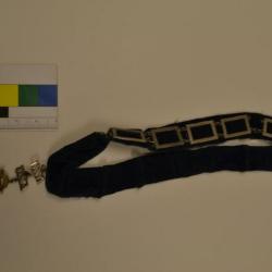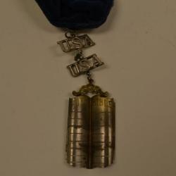 This belt is made of blue velvet. It has 14 metal rectangles attached to it. These squares have the Greek meander pattern around them. There are also two circle metals. Around them are the Greek meander pattern. In the center is a symbol of GAPA. Dangling off the bottom of this belt are three metals:two are of the letters "USA" and underneath those is figure the Bible. Sewn onto the blue velvet is a piece of material on which says "Rose Lipp Regalia Co. 175 Tremont St. Boston, Mass."