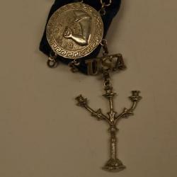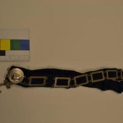 This belt is made of blue velvet. It has 14 metal rectangles attached to it. These squares have the Greek meander pattern around them. There are also two circle metals. Around them are the Greek meander pattern. In the center is a symbol of GAPA. Dangling off the bottom of this belt are two metals: one is of the letters "USA" and underneath that is figure of a candel-holder. Sewn onto the blue velvet is a piece of material on which says "Rose Lipp Regalia Co. 175 Tremont St. Boston, Mass."