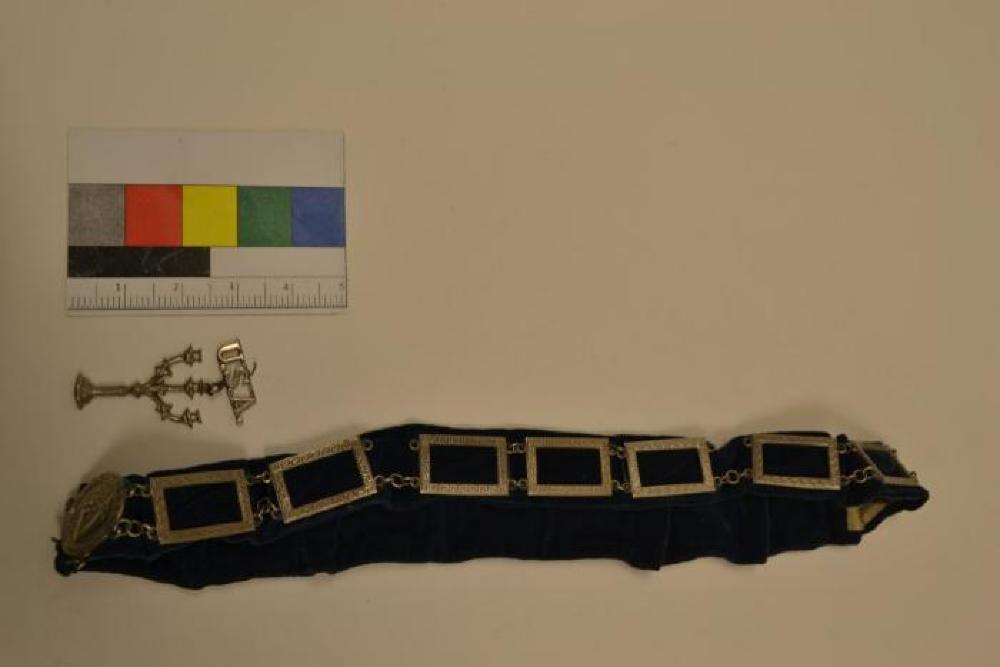 This belt is made of blue velvet. It has 14 metal rectangles attached to it. These squares have the Greek meander pattern around them. There are also two circle metals. Around them are the Greek meander pattern. In the center is a symbol of GAPA. Sewn onto the blue velvet is a piece of material on which "Rose Lipp Regalia Co. 175 Tremont St. Boston, Mass." is printed. The candle-holder pendant has fallen off.
