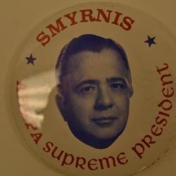 This pin is white and round. In red letters at the top is written 'Smyrnis" next to his name are 2 blue stars. At the bottom in red letters is "AHEPA supreme president". In the center of this pin is a picture of Nick Smyrnis.