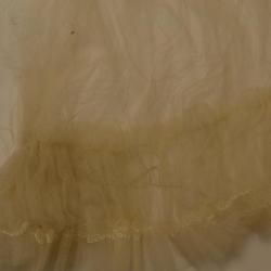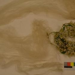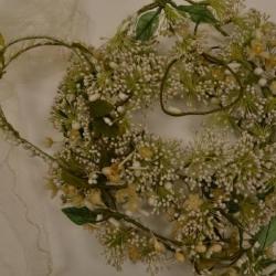 This veil was white but has altered its color due to age. The headpiece is made up of many fake flowers and leaves.