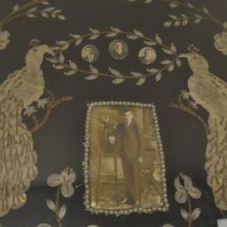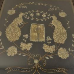This is an embraoidery piece with several photos. On the left and right side is a bird. Around the entire piece are embroidered flowers and vines. There is a large photo in the center of the piece, three at top, and one at the bottom. All the photos are balck and white. The piece is framed in a dark brown wood frame.