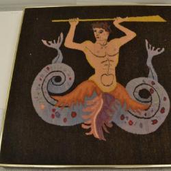 The background is brown. The top of the figure is human man, where his legs would be are tails of serpants. The whole piece is framed in a thin metal frame.