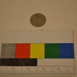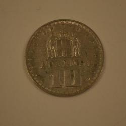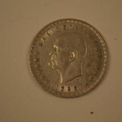 This is a 10 drachma coin from the year 1959. On the front side is a portrait of King Paul of Greece. He appears in a similar fashion to United States presidents on American coins. His name is written in Greek letters that circle his head. Underneath his head are the numbers 1959, signifying the year that the coin was minted. There is a basic pattern which borders the coin. The back of the coin features the Greek crest of the time. It is two mirror images of Hercules standing on either side of a shield with a cross on it. Underneath this crest is the word "drachma" written in Greek letters. Underneath the word "drachma" is the number 10, signifying the amount that the coin is worth. Greek words surround the entire coin. There is a simple pattern bordering this side of the coin as well. The coin has a silver color. It is made of copper and nickel. Its edge is smooth.
