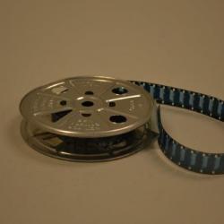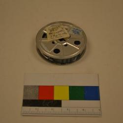 Silver Kodak 16mm film reel which is about half-full of film. Stamped into the metal reel are the words "Made in U.S.A.", "By Kodak", "Not for camera use", and "Pat. USA 2,384,621 Canada 1946". There are holes in the same pattern on both metal discs. Discs are attached at their center by a black, metal cylinder. It is unknown what the film on the reel contains. A white and a blue piece of paper are attached to the front of the reel with tape. It is impossible to read the words written on these pieces of paper. There is another blue piece of paper stapled to the film itself. It appears that "Argos statue and people" is written on this piece of paper.