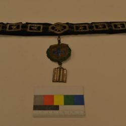 On a necklace of blue velvet, slightly worn, are the jewels a series of 14 silver rectangular forms with a five point star, with an additional 2 clouded ovals with 8 pointed stars. Silver rectangles and ovals are joined to one another by three chain links at the top and the bottom of each rectangle/oval, on both sides. Hanging from below one of the clouded ovals is a metal, colored AHEPA emblem embossed. The cross is colored blue, while the olive branch at the bottom is colored green. Attached is the insignia of each office. In this case, a bible page for the chaplain.