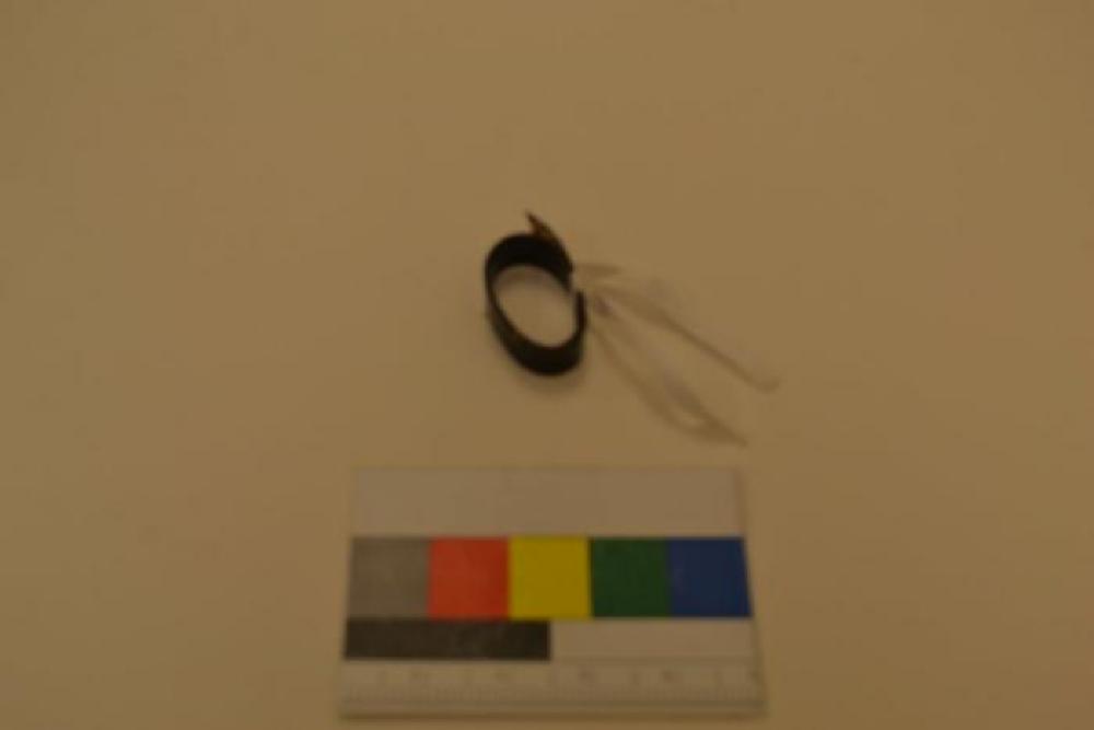 Black 16mm film. Contents of film are unknown. The film is not bound to a reel. It measures 16mm in width and there are holes on both edges of the film at 6mm intervals. The film has become misshapen and is bound in an oval shape. There is a small yellow crusty substance attached to this strip of film. The first few slides of the film depict two boats on a body of water. It is impossible to tell what body of water this is.