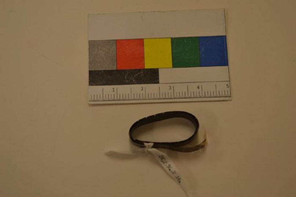 16mm film strip of a house. This is continuous shot of a house from the street. There are a couple of trees in front of the house but the picture quality is lessened because the film is quite brown/yellow and so other colors are not as clear. There is a piece of tape on the exterior tip of the film.