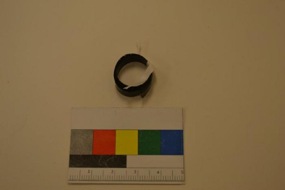 Black 16mm film. Contents of film are unknown. The film is not bound to a reel. It measures 16mm in width and there are holes on both edges of the film at 6mm intervals. The film has retained its shape and is circularly bound. There is sticky tape residue at the beginning of the strip. The first few slides show the Parthenon from an above view.