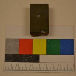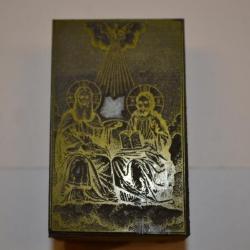 Donated by John Damianos. The printing block was used in a linotype printing machine. Linotype presses allowed for the casting of entire lines to be printed at a time. Linotype printing was eventually succeeded by lithograph printing and computer typesetting during the 1960's and 1970's. This printing block was used by the Chicago-based, Greek Art Printing Company, which was founded in 1914. The print image was used for the printing of letterhead for the Parish Life newsletter that was published and distributed by Holy Trinity Greek Orthodox Church of 742 South Ada Street, Chicago. Holy Trinity was established in 1897 as the first Greek Orthodox parish in the Midwest. The visual elements in the print image each have symbolic meaning. The placing of the figures among the clouds signifies their place in Heaven. Jesus is seated at the "right hand of the Father" as it is told in Scripture. Jesus holding an open book signifies Jesus the Teacher. The hand gesture Jesus is making with his right hand symbolizes the abbreviation ICXC, which are the first and last letters of the Greek name for Jesus Christ. The extended little finger forms the I. The curved ring finger forms the first C. The crossed middle and pointer fingers form the X. And the curved thumb forms the last C. The abbreviation, and therefore the gesture of the abbreviation, also symbolizes Jesus being the "Alpha and the Omega," i.e. "the first and the last," because the abbreviation is formed by the first and last letters of each word in the Greek translation of "Jesus Christ." The sceptre that God holds in his left hand signifies his supreme power. The placement of the Omicron, Omega and Nu characters in the halo's of God and Jesus is most commonly translated as "He who is." Therefore, "He who is God" and "He who is Jesus Christ." The dove represents the Holy Spirit. The dove is commonly shown casting light upon both Jesus and God as a representation of the Holy Spirit making it possible for humans to know Jesus and God. The idea of the Holy Spirit making God and Jesus known to humans is part of a common interpretation of the Bible in which the Holy Spirit is believed to have preceeded God and Christ. The placement of the dove above and between God and Jesus, in this case, as well as the casting of the light, forms a triangle between the three members of the trinity. Triangles are commonly used in icons as basic symbols of the Holy Trinity.